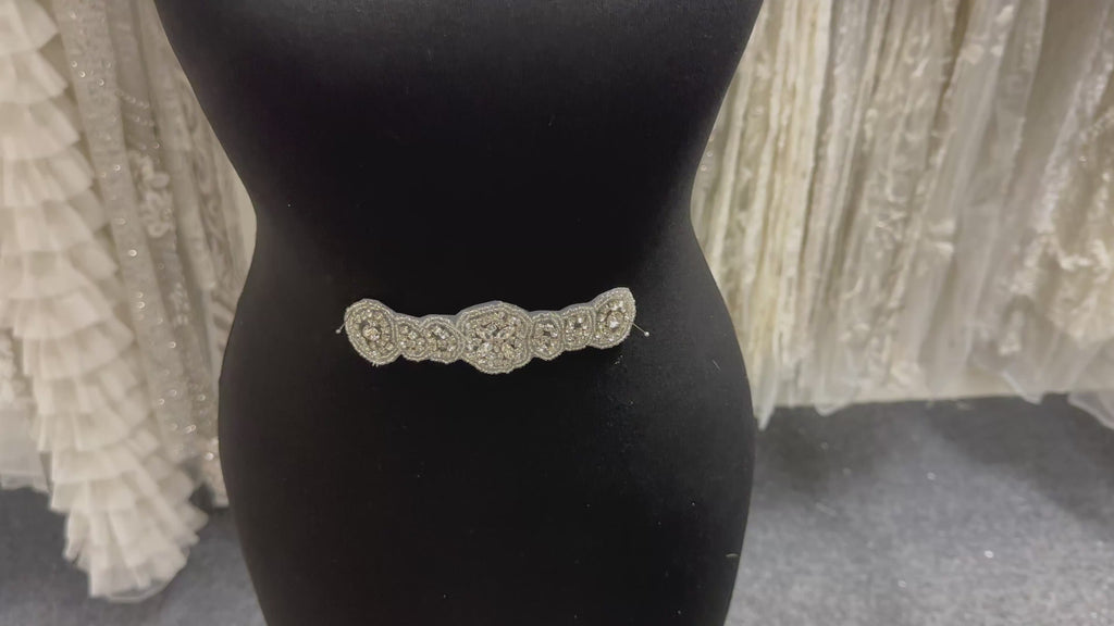 Add a sparkling finishing touch to your bridal or eveningwear designs with this small crystal and bead embellished motif. Measuring approximately 13 cm x 4 cm, it’s the perfect accent for waistbands, shoulder straps, or delicate detailing on gowns and couture pieces.